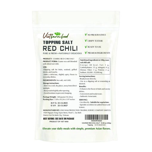 PREMIUM COARSE RED CHILI SALT – A high-quality vegetarian blend featuring coarse sea salt and dried red chili. This specialty seasoning delivers a delicious, slightly spicy flavor and authentic Asian taste to your daily dishes.