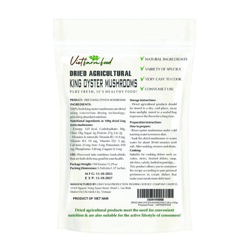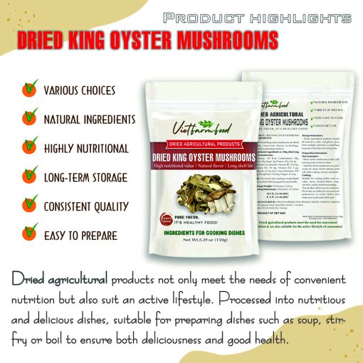 DRIED KING OYSTER MUSHROOM 5.29 Oz (150g) VIETFARMFOOD: Dried agricultural products with pure natural flavor. Used as cooking ingredient to prepare delicious, nutritious dish, suitable for vegetarian