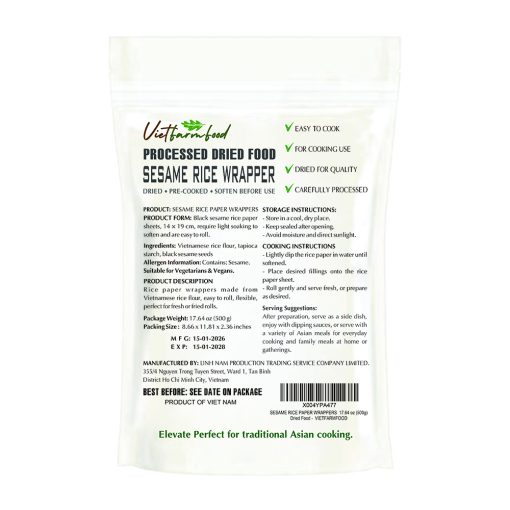✨ Sesame rice paper wrappers are crafted from high-quality Vietnamese rice flour, tapioca starch, and premium black sesame seeds, providing a unique nutty flavor and a beautiful speckled appearance to your dishes.