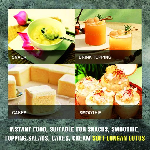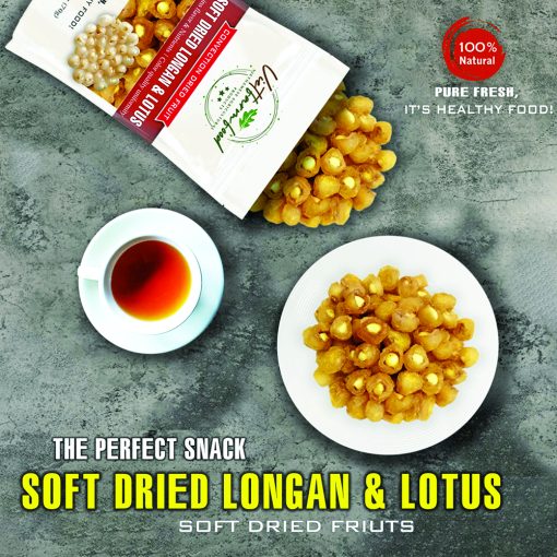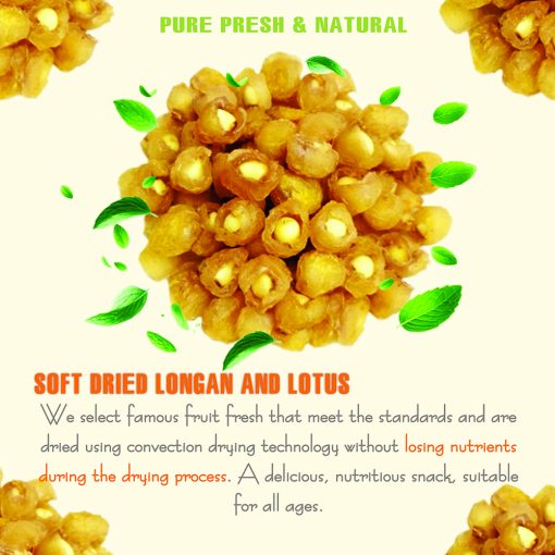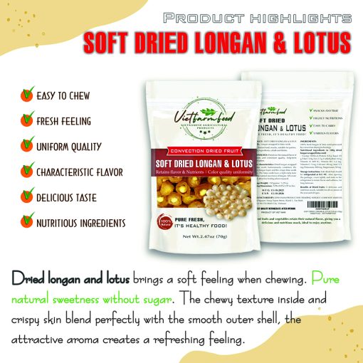 SOFT DRIED LONGAN & LOTUS 5.29oz (150g) VIETFARMFOOD: Convection dried fruit with a little sugar, salt, natural sweetness, soft when chewed. Suitable for snack, healthy dessert for all ages